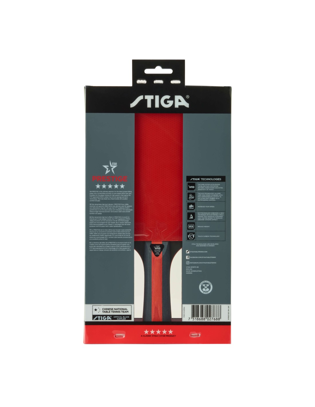 Stiga Prestige er med en S5 gummi belægning, som giver super god spin til dine bolde, samt top speed i dine slag