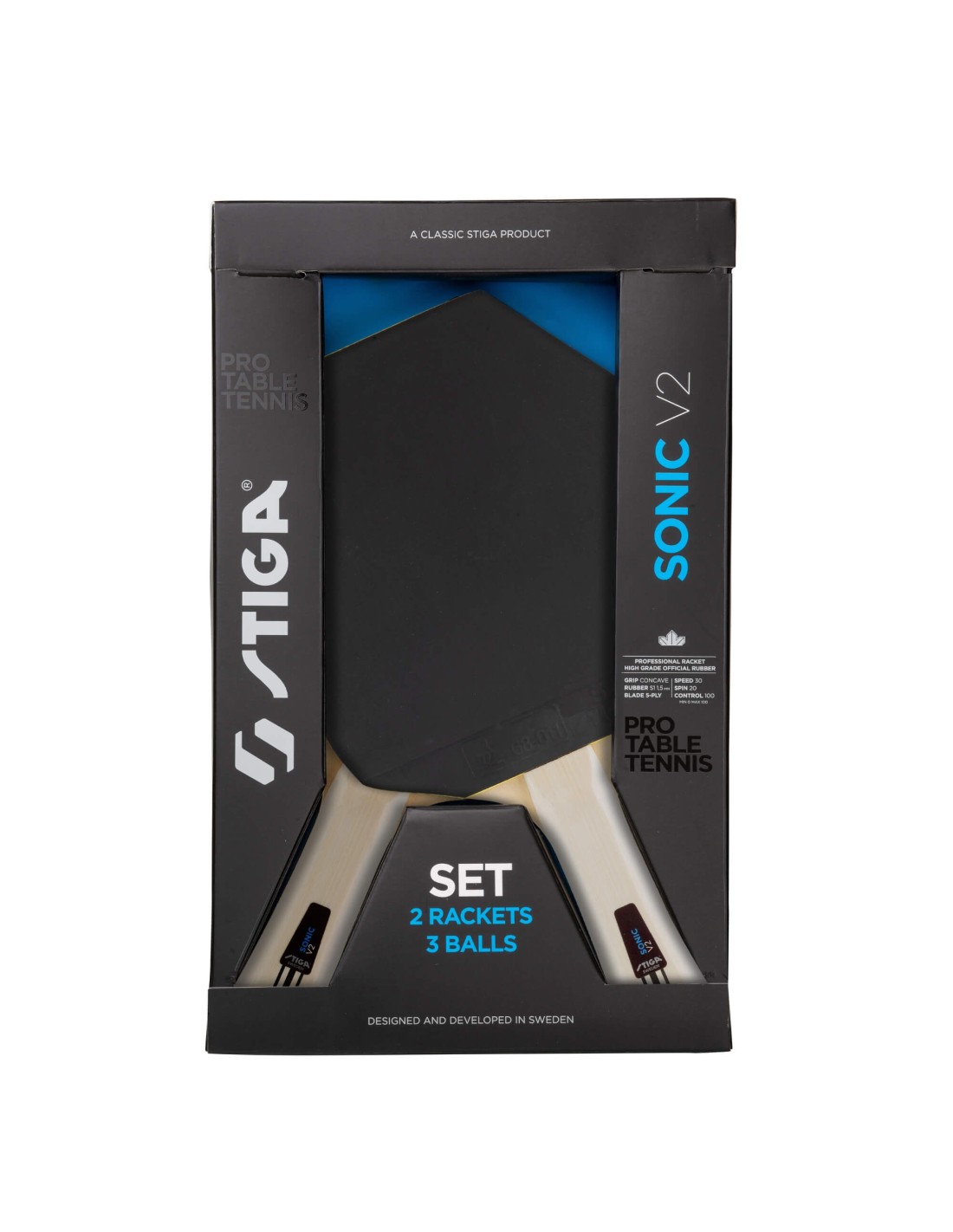 Stiga Set Sonic V2 har et kvalitets-blad med fem lag, som skaber en perfekt balance mellem hastighed, spin og især kontrol.